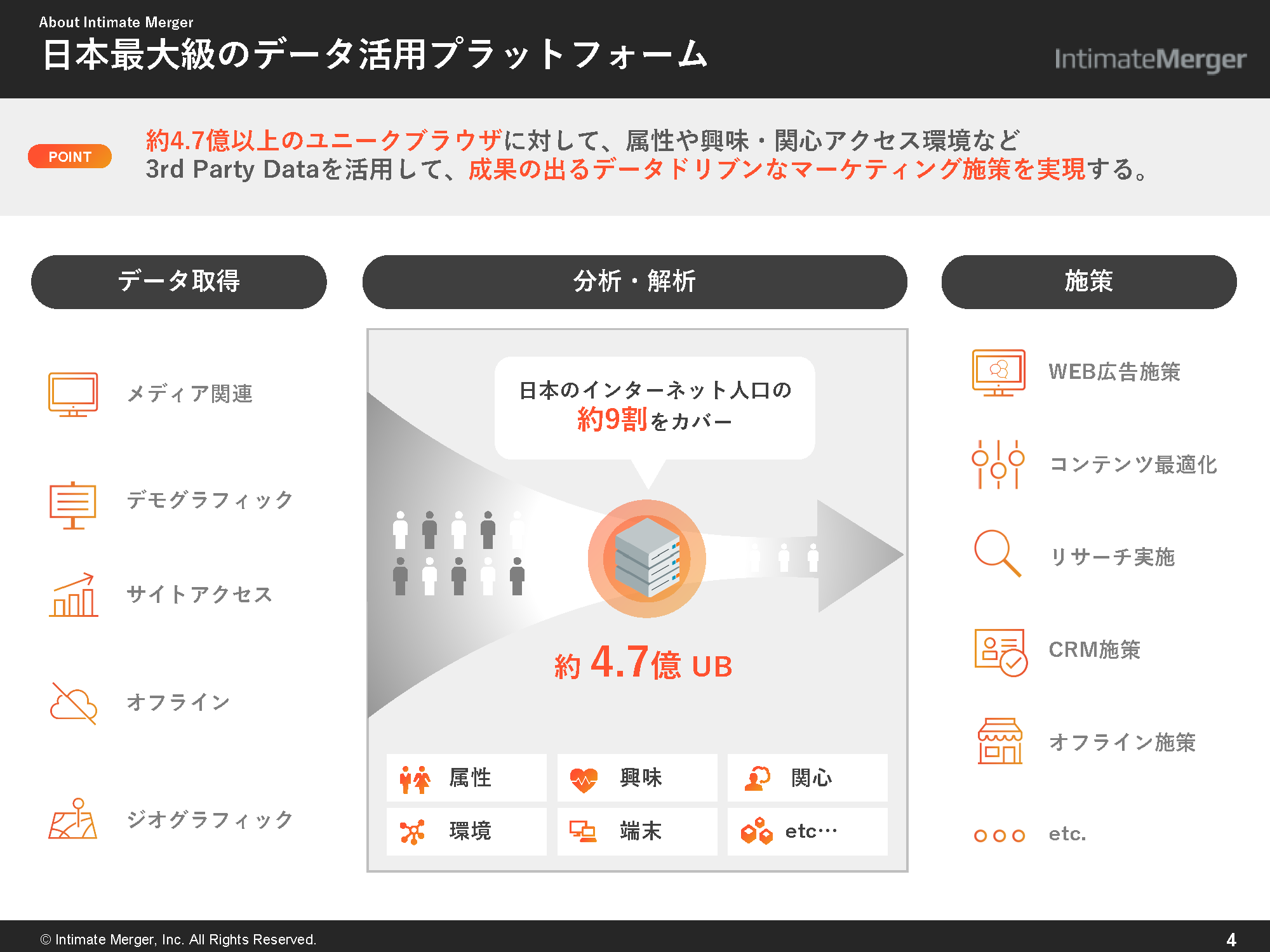 IM-DMPは、「提携のポータルサイト」「生活情報サイト」「Q&Aサイト」「まとめサイト」などの大規模メディアやインターネットリサーチを通じて、約4.7億ユニークブラウザのオーディエンスデータを取得しています。