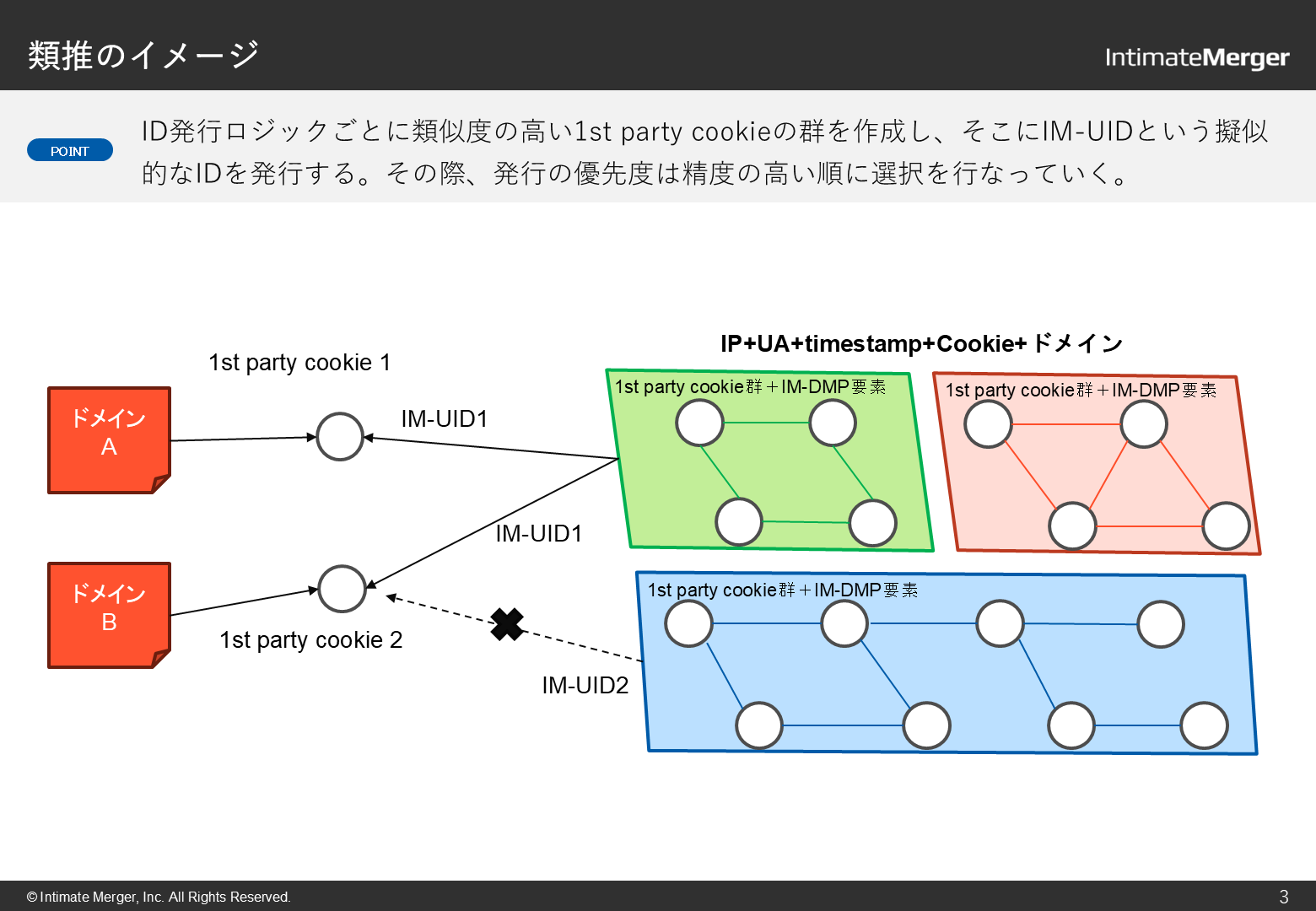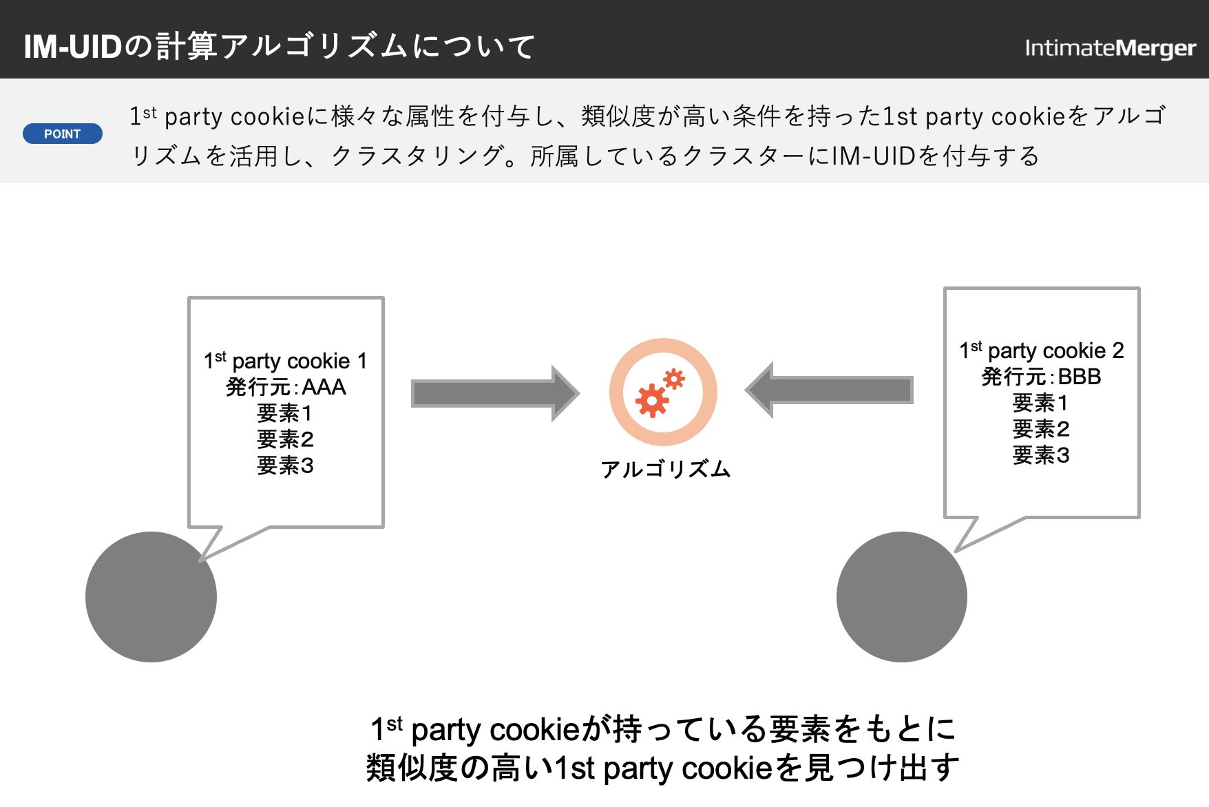 IM-UIDは、「IPアドレス」「ユーザーエージェント(OS、ブラウザ、ブラウザのバージョン、デバイス種別など)」「タイムスタンプ」「アクセス先URL」「ドメインに紐づくファーストパーティデータ」などの情報を使って、類似した動きをしているユーザーをクラスターに分類し、クラスターに割り振るIDです。