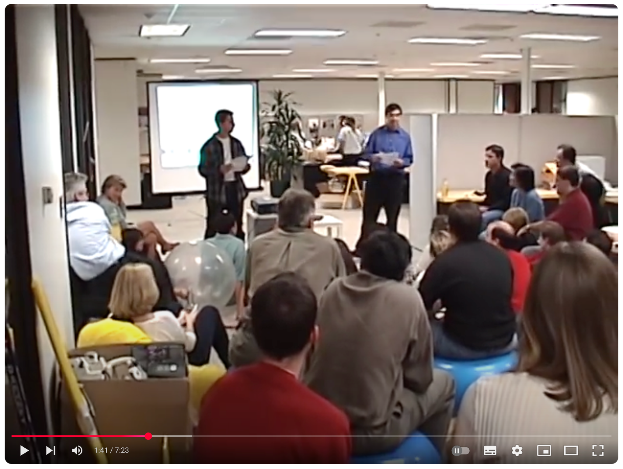 下の動画は1999年頃のTGIF(Thanks God Its Fridayの略で、毎週金曜の夕方に行われるGoogleの社内ミーティング)の様子です。