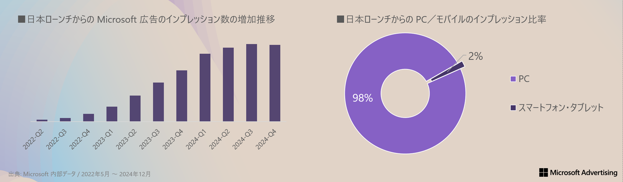 Microsoft 広告のインプレッション数は、Bing や MSN の利用者増に伴い、2022年5月31日の日本市場リリース以降、増加傾向にあります。