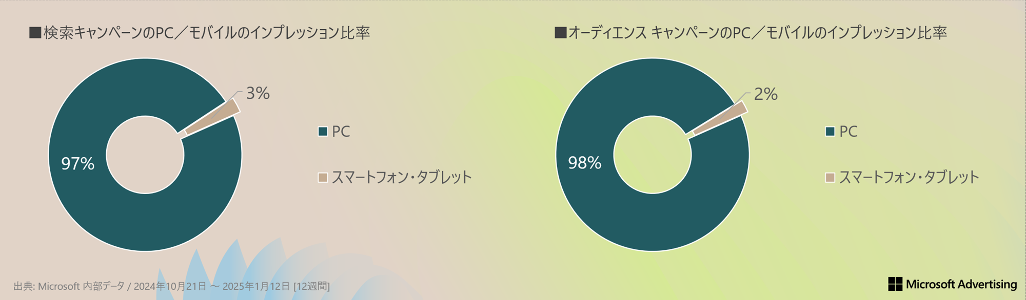 Microsoft 広告では、「検索キャンペーン」と「オーディエンス キャンペーン」の両方で、Windows PC ユーザーが多いのが特徴です。