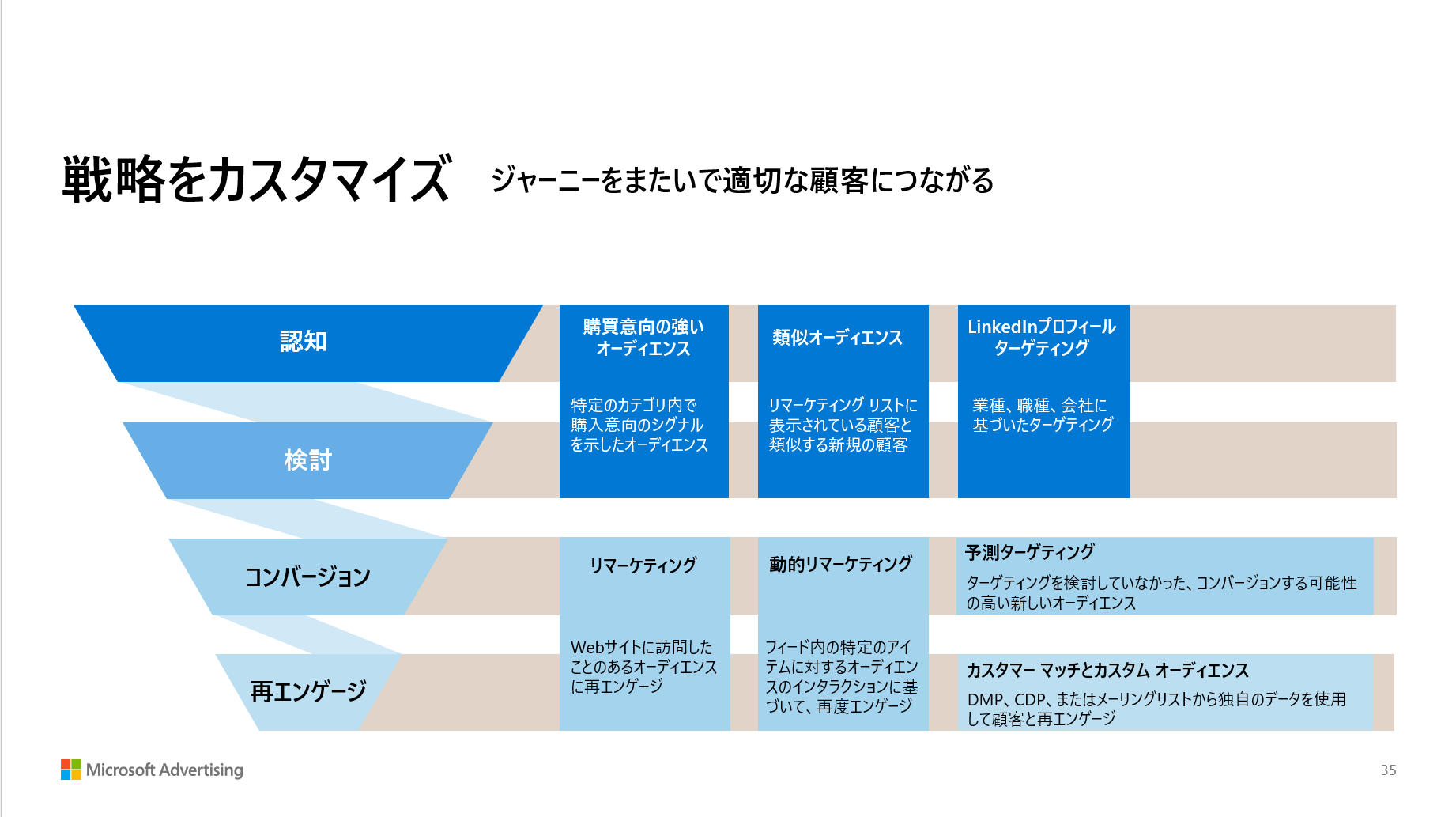 Microsoft 広告は、マーケティングファネルのすべての段階(フルファネル)に対応しているため、どのフェーズの商材にも適用できます。