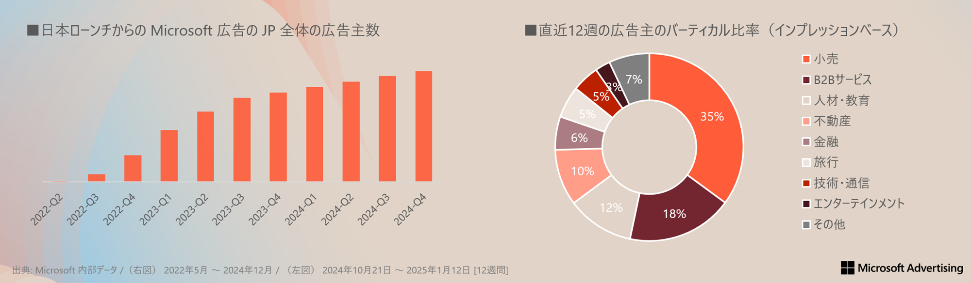 Microsoft 広告を利用する企業は年々増加しています。2024年10月21日~2025年1月12日のインプレッション数(業界別)全体の75%を占めるのは、以下の業界です。