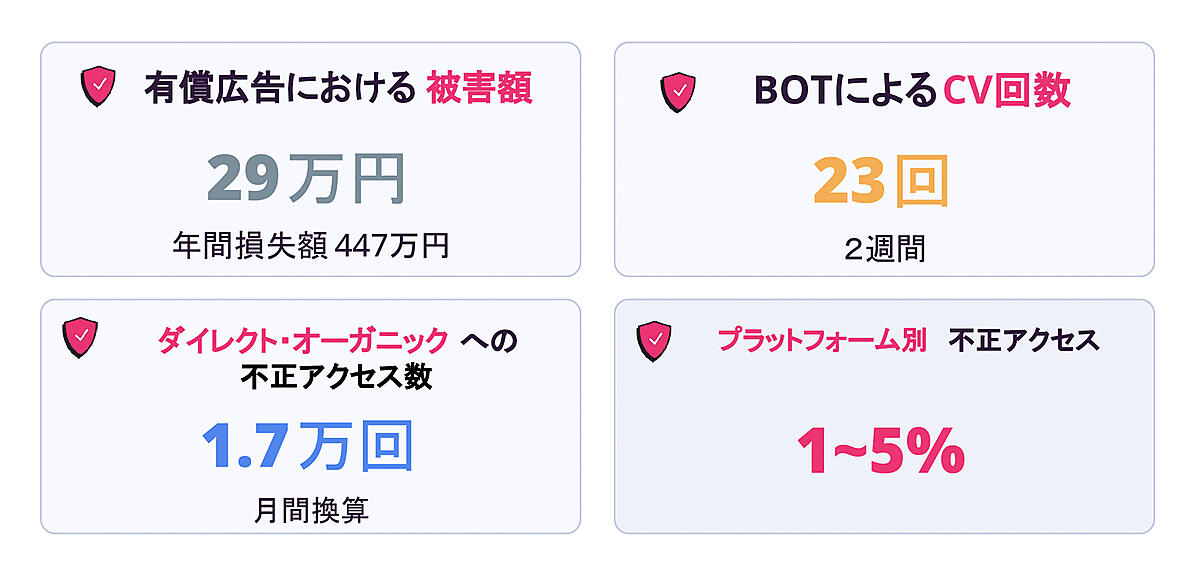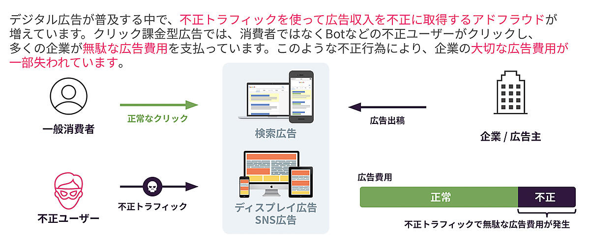 無料診断を通じて判明したもう1つの大きな問題が、広告主や広告代理店の予算を不正に搾取する「アドフラウド」だ。本来、新規顧客となり得るユーザーに広告を配信し、コンバージョンへとつなげることがWeb広告の目的だが、不正ユーザーに広告をクリックされることで、貴重な広告予算が無駄になっていることが明らかになったのだ。