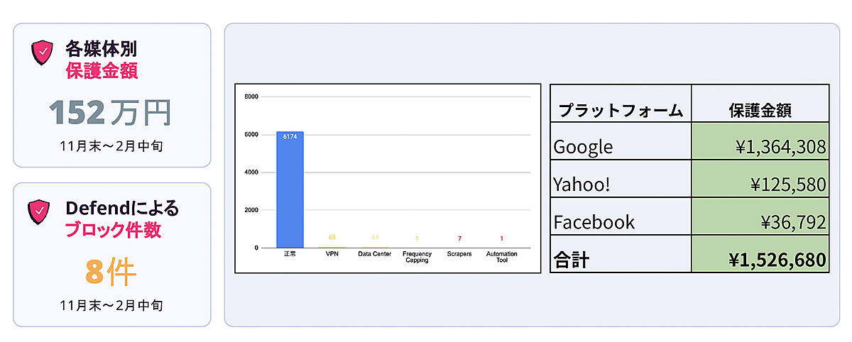 アドフラウド対策によってWeb広告費の無駄も削減された。導入後、2か月で152万円分の広告予算を不正トラフィックから保護し、本来リーチすべき正規のユーザーに広告を届けることができるようになった。広告の効果が高まり、ROI(投資対効果)も向上した。また、不正トラフィックによる影響が減ったことで、コンバージョンデータの精度が向上し、マーケティング施策の最適化にも貢献している。