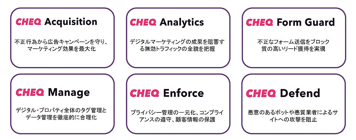 チェクが提供しているソリューションのうち、駿河台学園が導入したのはアドフラウド対策の「Acquisition」とオーガニックで流入する不正トラフィックをブロックする「Defend」の2つだ。他にも不正な登録から入力フォームを守る「Form Guard」やGA4、BIツール、CDPとの連携することでより詳細なトラフィック分析を実現するの「Analytics」など、6つのソリューションを提供している。