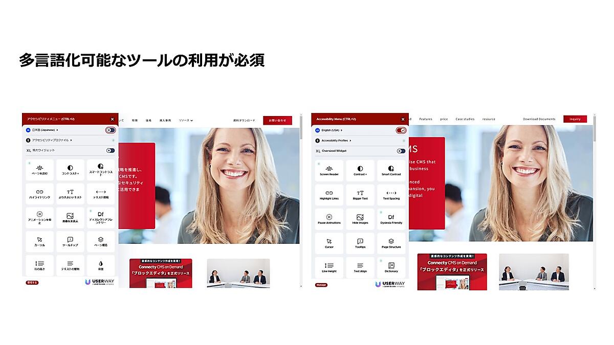 アクセシビリティ対応への一例として、服部氏は同社が提供するAI活用のウェブアクセシビリティツール「UserWay」の活用を挙げた。このツールは、国際的なWebアクセシビリティガイドラインであるWCAG2.1およびWCAG2.2に準拠しており、AIを活用して自動的にアクセシビリティを改善する。