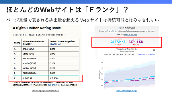 ここで榛葉氏は、Webサイトのページサイズによって、そのWebサイトの環境負荷を評価する試みについて紹介した。