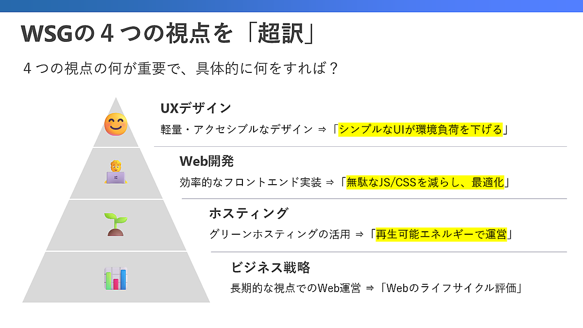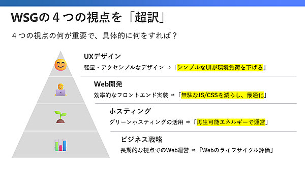 WSG1.0は、実際にWebサイトの構築・運営に携わる人に関係する4つの視点に整理されており、榛葉氏はその要諦を次のように紹介した。