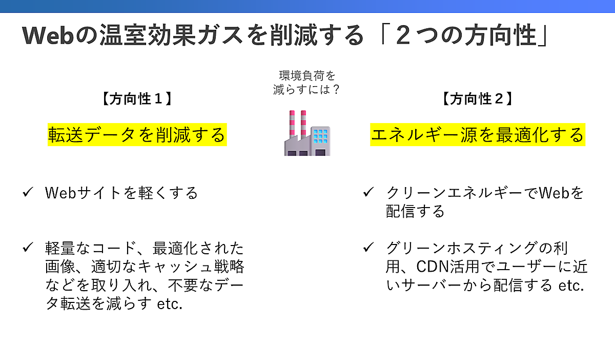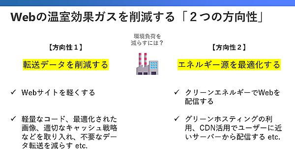 これとWSG1.0から、サステナブルWebを実現するには、「転送データを削減することでWebサイトを軽くする」「エネルギー源をクリーンエネルギーとする」の“2つの方向性”が考えられます(榛葉氏)