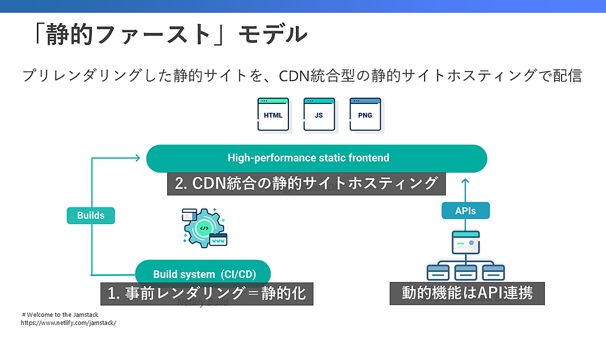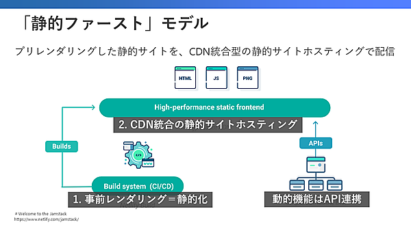 この潮流を特徴づけたのが、「Jamstack」であり、フロントエンド技術と静的サイトホスティングによる「静的ファースト」モデルであることがポイントとなる。