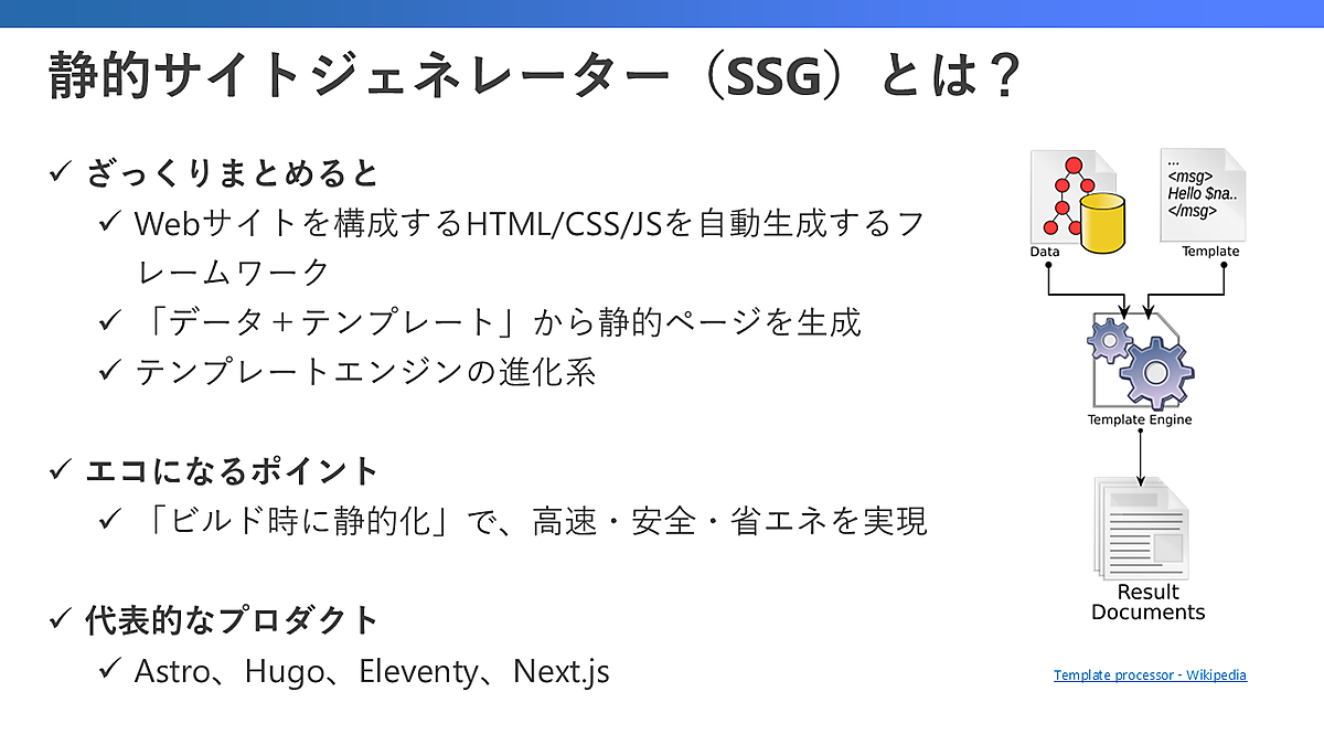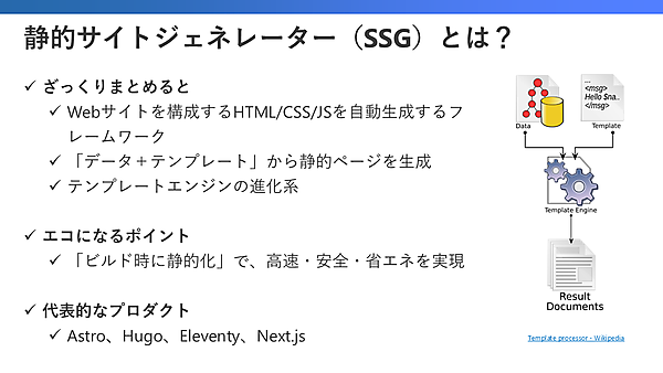 静的サイトジェネレーターは、一言でいうなら「テンプレートエンジンの進化系」だ。Webサイトを構成するHTML/CSS/JSを自動生成するフレームワークであり、「データ+テンプレート」で静的ページを生成する。作り置きされたページを配信することで、高速・安全・省エネとなりサステナブルWebサイトに貢献する。