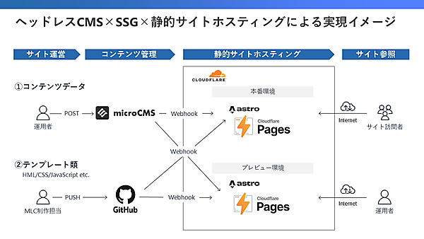榛葉氏は、ヘッドレスCMSと静的サイトジェネレーター、静的サイトホスティングによるシステム構成のイメージを掲げ、「レゴブロックで組み立てるように、それぞれをビルディングブロックとして組み立て、Webサイトの運営基盤を構築する感じ」と表現した。