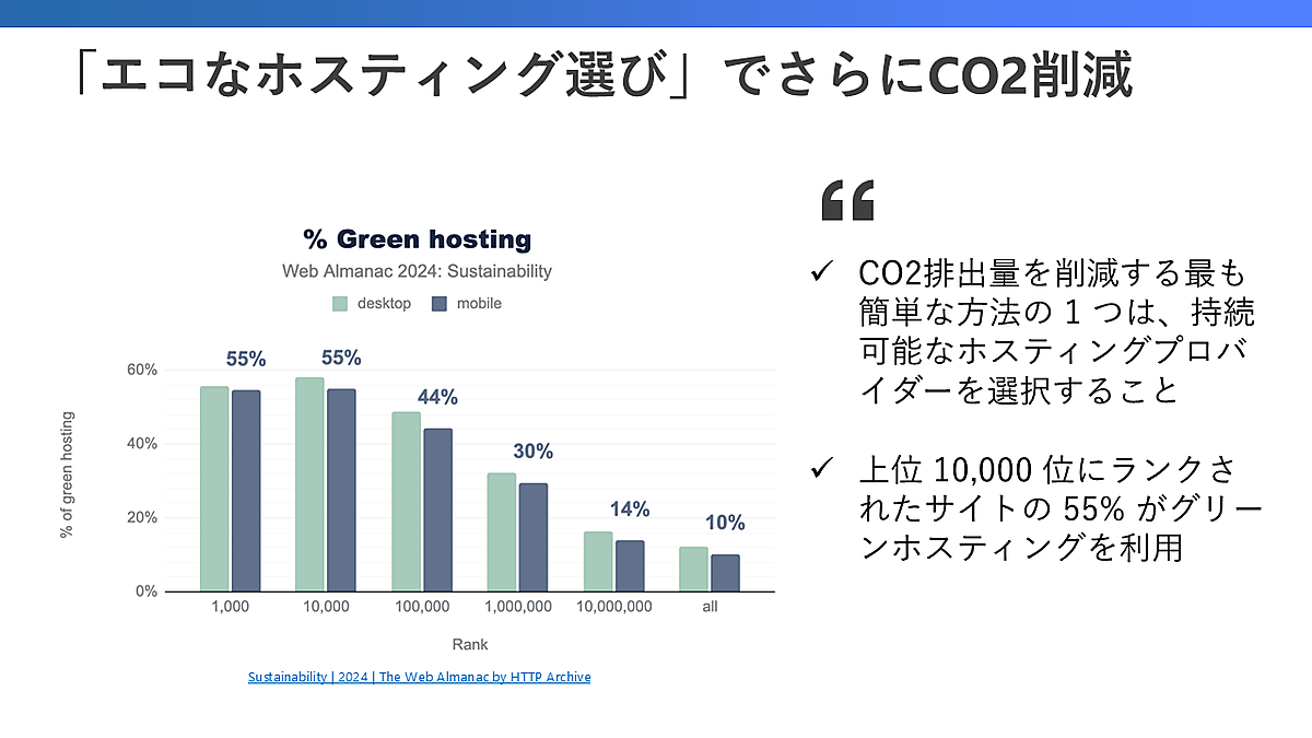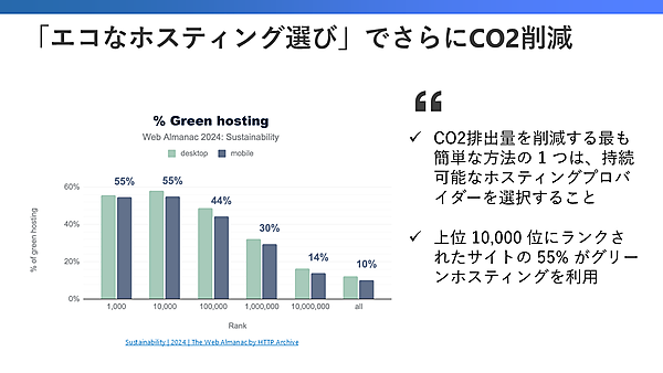 Webサイトで温室効果ガスを削減する最も簡単で有効な方法は、再生可能エネルギーなどのクリーンエネルギーで稼働する「グリーンホスティング」のサービスを積極的に利用することだ。トラフィック数上位1万のサイトの55%がすでに利用しているとされる。なぜなら、ビッグテックとよばれる大手クラウドサービスのほとんどが環境対策に大規模に投資しているためだ。