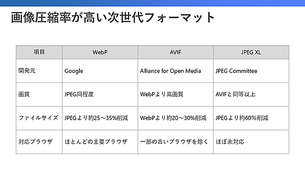 - 圧縮率の高い最新の画像フォーマットを採用する