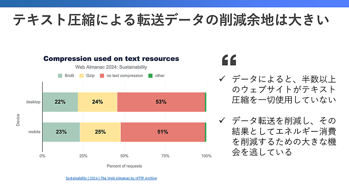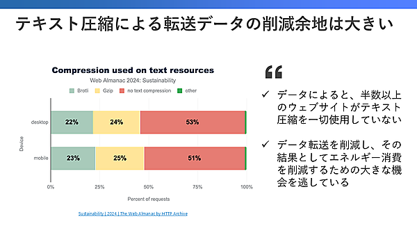 テキスト圧縮については、半数以上のウェブサイトが行なっていないというレポートもある。榛葉氏は「エネルギー消費を削減するための大きな機会を逃している」と指摘し、「決して難しいことではないので取り組んでみてはどうだろうか」と語った。