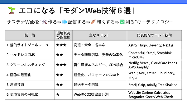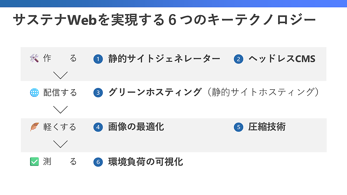 サステナブルなWebのためには、「作る」「配信する」「もっと軽くする」「測る」という4つのステップにおいて、6つのキーテクノロジーが有効だ。