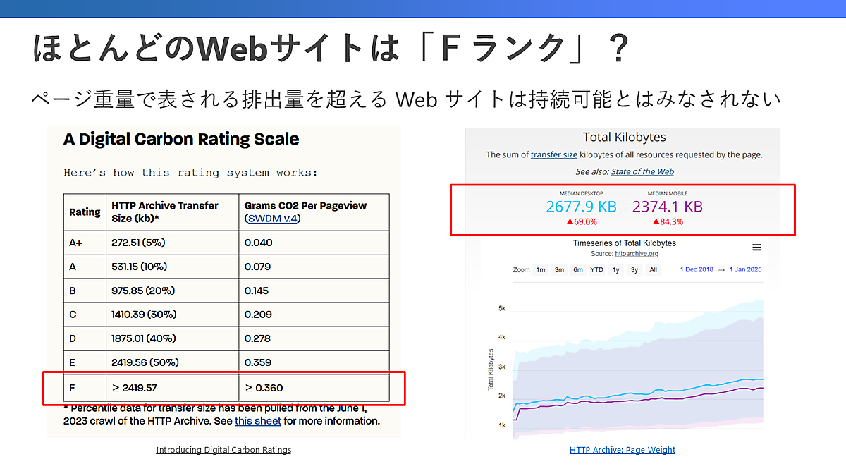 この評価モデルでは、2.4メガバイトを超えると「Fランク=落第」としている。一方で、全世界のWebページの重さの中央値は最新データで2.6メガバイトを超えており、多くのWebサイトがFランクと判定されてしまうという。