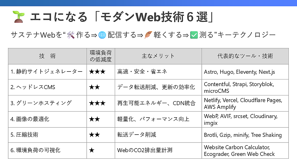 この2つの方向性を具現化するのが、「モダンWeb技術」であり、「より高速、より安全、スケーラブルで、より環境に優しいWebを志向する技術」である。