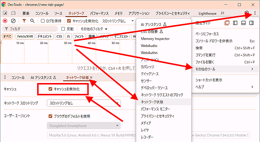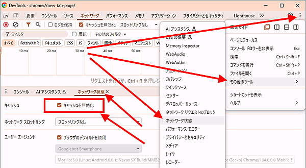 無効化していない場合は、DevToolsで[︙]メニューから[その他のツール]>[ネットワーク状態]を選択し、下部に表示されるパネルで[キャッシュを無効化]オプションにチェックを入れる。