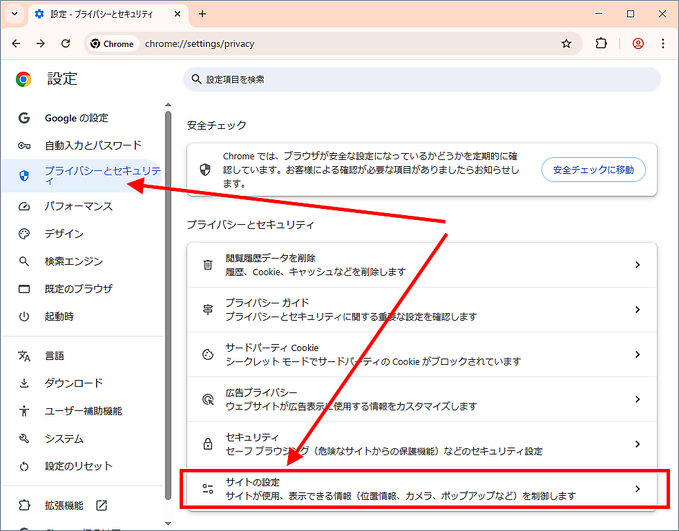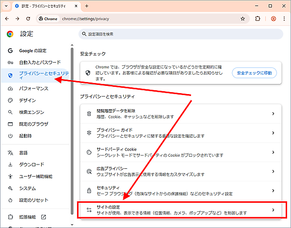 Chromeの[︙]メニューで[設定]を選んで設定画面を表示し、左側の[プライバシーとセキュリティ]を選択する。右側のペインにある「プライバシーとセキュリティ」の[サイトの設定]を選ぶ。