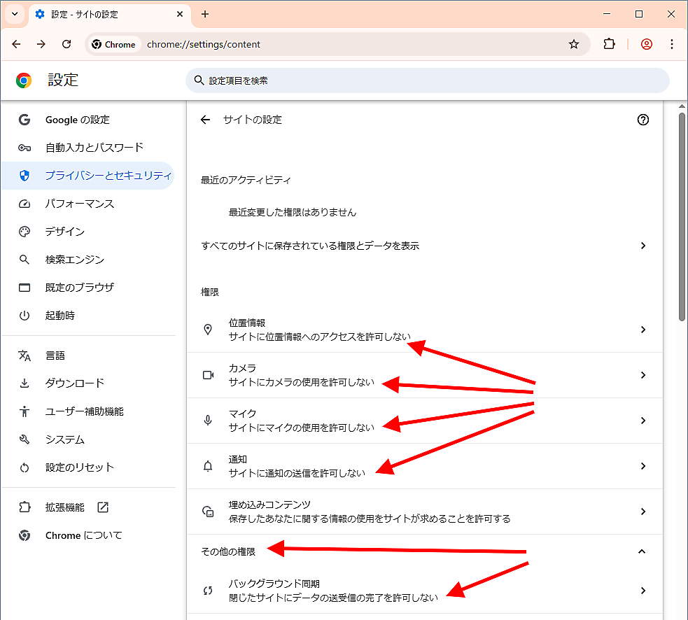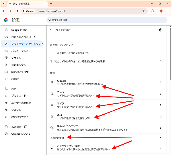 - マイク ―― 「サイトにマイクの使用を許可しない」にする
