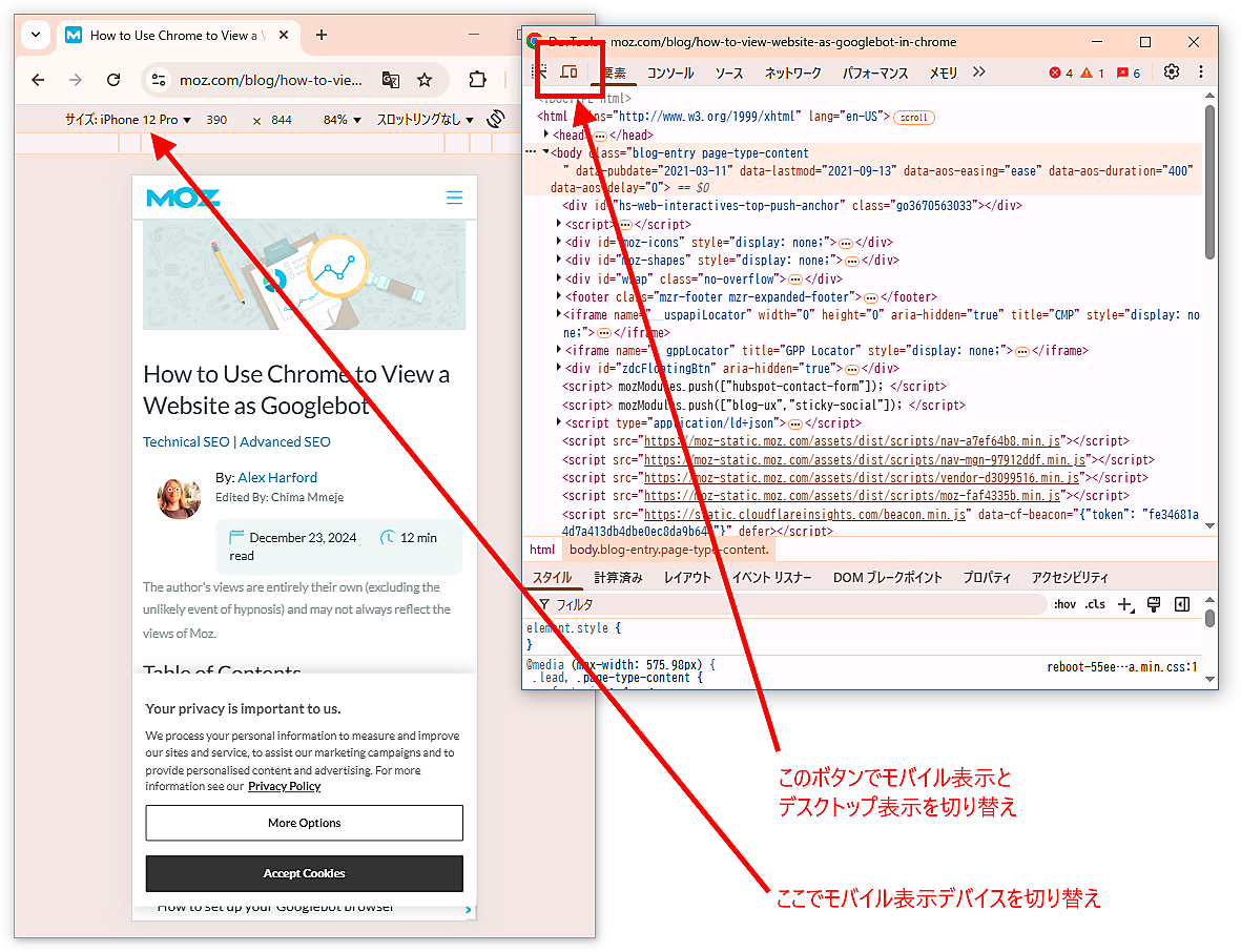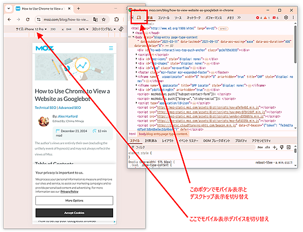 Googlebotは主にモバイルファーストインデックスを採用しているため、Googlebotブラウザでモバイルデバイスをエミュレートすることが重要だ。