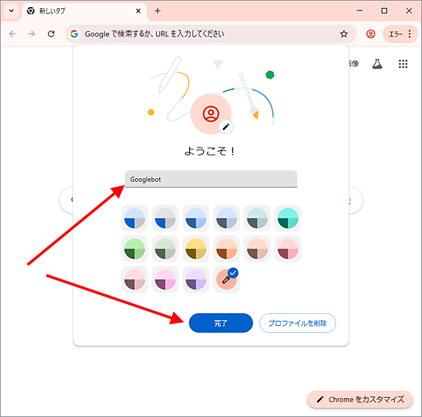新しいウィンドウが開き、プロファイルの基本設定をするダイアログボックスが表示されるので、「Googlebot」などプロファイルの名前を指定して、[完了]をクリックする。
