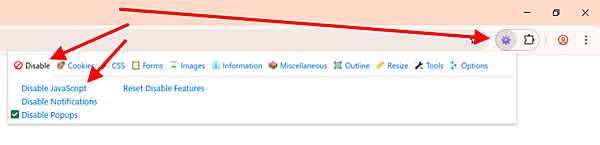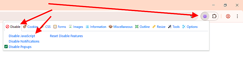 Web Developerを使ってJavaScriptを無効にするには、次のようにする: