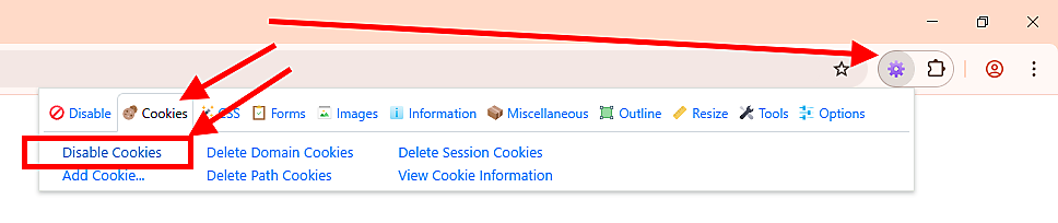 Web Developerのメニューが表示されるので、[Cookies]タブにある[Disable Cookies]をクリックする。