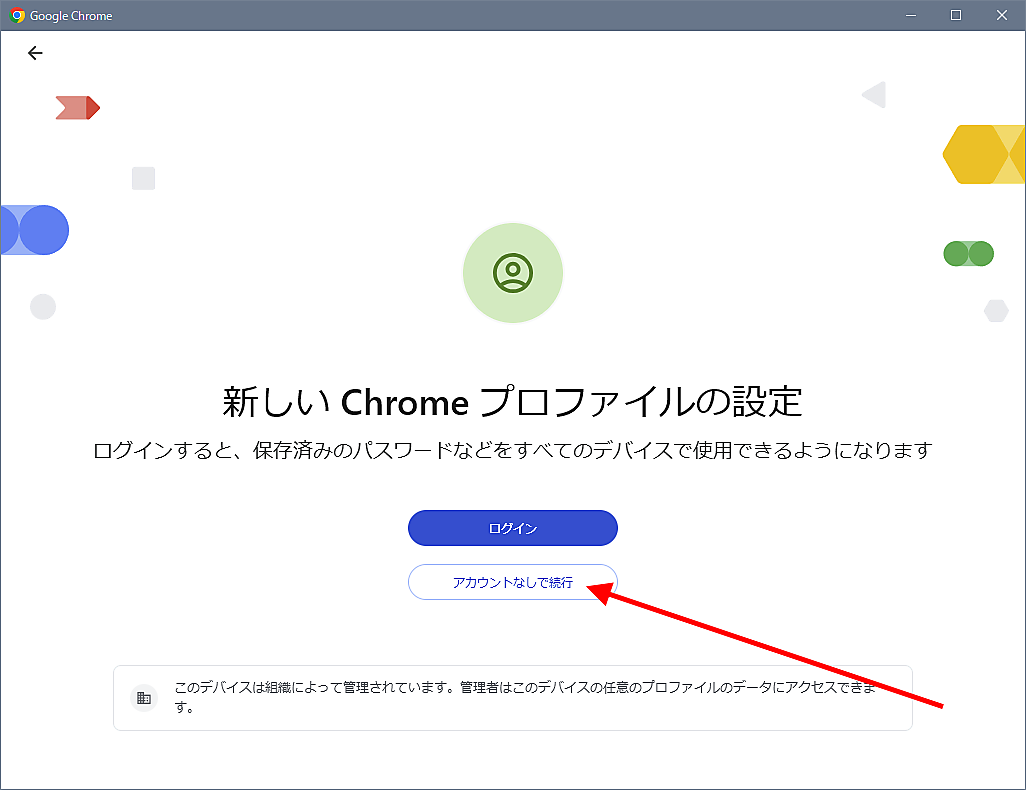 「新しいChromeプロファイルの設定」画面が開くので、[アカウントなしで続行]をクリックする。