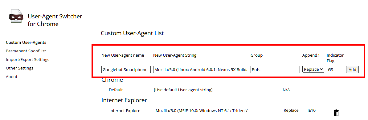 入力欄 役割 入力例 New User-agent name 表示名 Googlebot SmartphoneNew User-Agent String ユーザーエージェント名 ※さきほどコピーした値をここに貼り付ける Group 一覧表示でのグループ名 BotsAppend? 追加するのか置き換えるのか ReplaceIndicator Flag ブラウザのツールバーでの表示ラベル GS入力したら[Add]ボタンをクリックしておく。