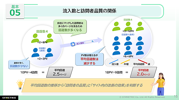 次は、サイト改善策と訪問者品質を評価するために、PVを「流入」と「回遊」に分解して見ていく手法が解説された。