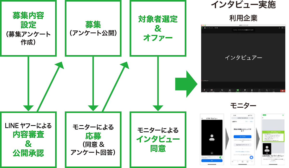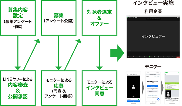 「Quickインタビュー」は、新たにライトコースのメニューとして提供される。利用する企業は、LINEリサーチモニターの中から、調査テーマに合った対象者を募集し、最短当日中(※2)にオンライン上(※3)でインタビューを実施できる(図1)。