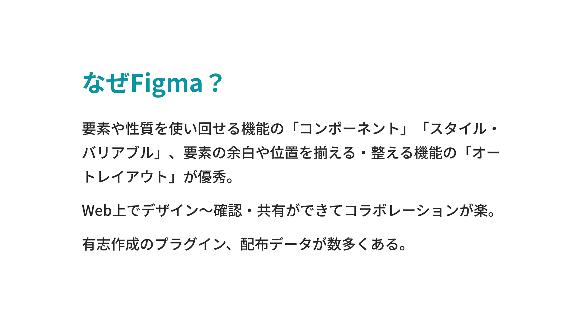 ここまでは、非デザイナー向けのFigmaの基本機能。この他にも、デザインの大量生産をサポートするための機能は多い。