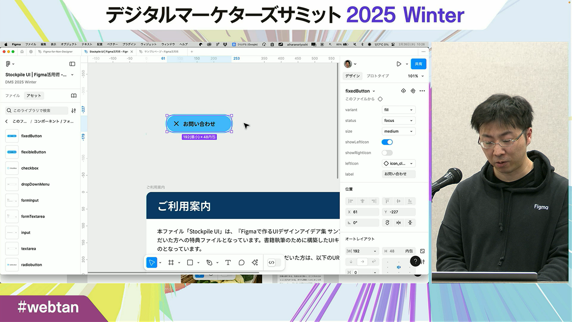 しかしコンポーネント機能のもとで共通ボタンを作っておけば、修正が比較的簡単になる。ボタンに記載するコメントだけでなく、色なども変更できる。後の修正を容易にするためには、初期段階である程度の作り込みが必要とのことだが、たとえば規模の大きなサイトでボタンデザインを10~20個作るようなケースでは、管理が圧倒的に楽になると相原氏は補足する。なお講演では詳しい言及はされなかったが、「スタイル」及び「バリアブル」機能も非常に便利なので、名前だけでも知っておいてほしいという。