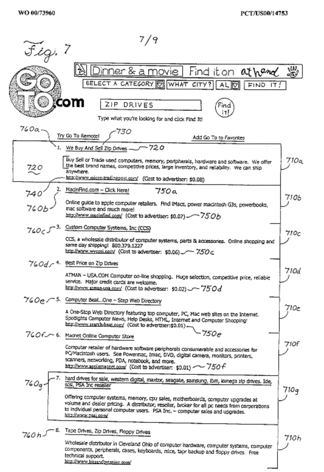 杉原:下の画像は、GoTo.com時代に取得した検索連動型広告の特許資料です。よく見ると、それぞれの広告文の横に「Cost to advertiser: $0.08」などと記載されていて、広告主がオークション形式で入札し、価格に応じて掲載順位が決まる仕組みがわかります。