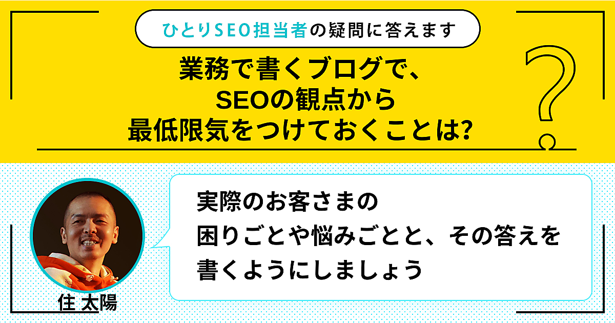 ひとりで頑張るSEO担当者さんの悩みに答える本連載。今回の質問は「業務で書くブログで、SEOの観点から最低限気をつけておくことは?」です。この回答は「実際のお客さまの困りごとや悩みごとと、その答えを書くようにしましょう」です。