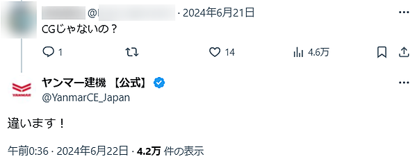 ヤンマー建機が投稿した動画はわずか6秒と短いものでしたが、ショベルカーでの華麗なリフティングは多くのユーザーに驚きを与えたようです。「うますぎる」「すごすぎ」といった賞賛のコメントが大多数で、公式アカウントがこうした投稿(ミームを取り入れた投稿)をするのを好ましく感じるという声もありました。