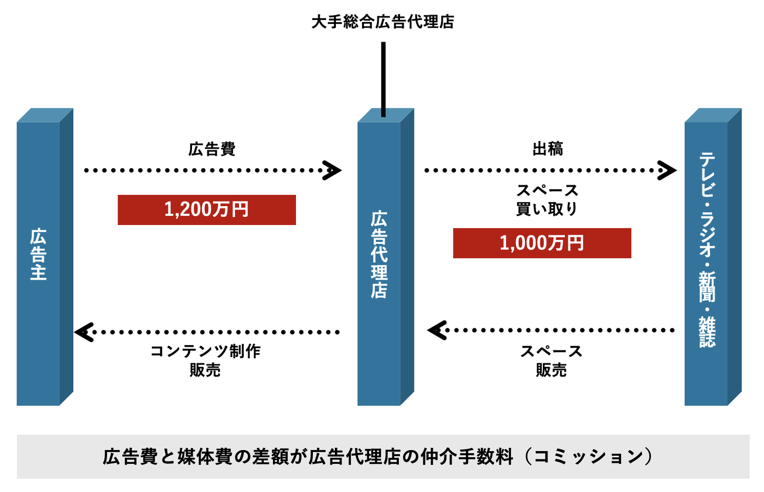 佐藤: 通常、テレビや雑誌などの広告は、大手総合代理店がテレビ局の持つ広告枠をあらかじめ買い取り、それを広告主に仲介する形で販売します。広告主が広告代理店に支払う費用と、広告代理店がテレビ局などに支払う「媒体費の差額が広告代理店の仲介手数料」となります。この仕組みは「コミッション」と呼ばれています。