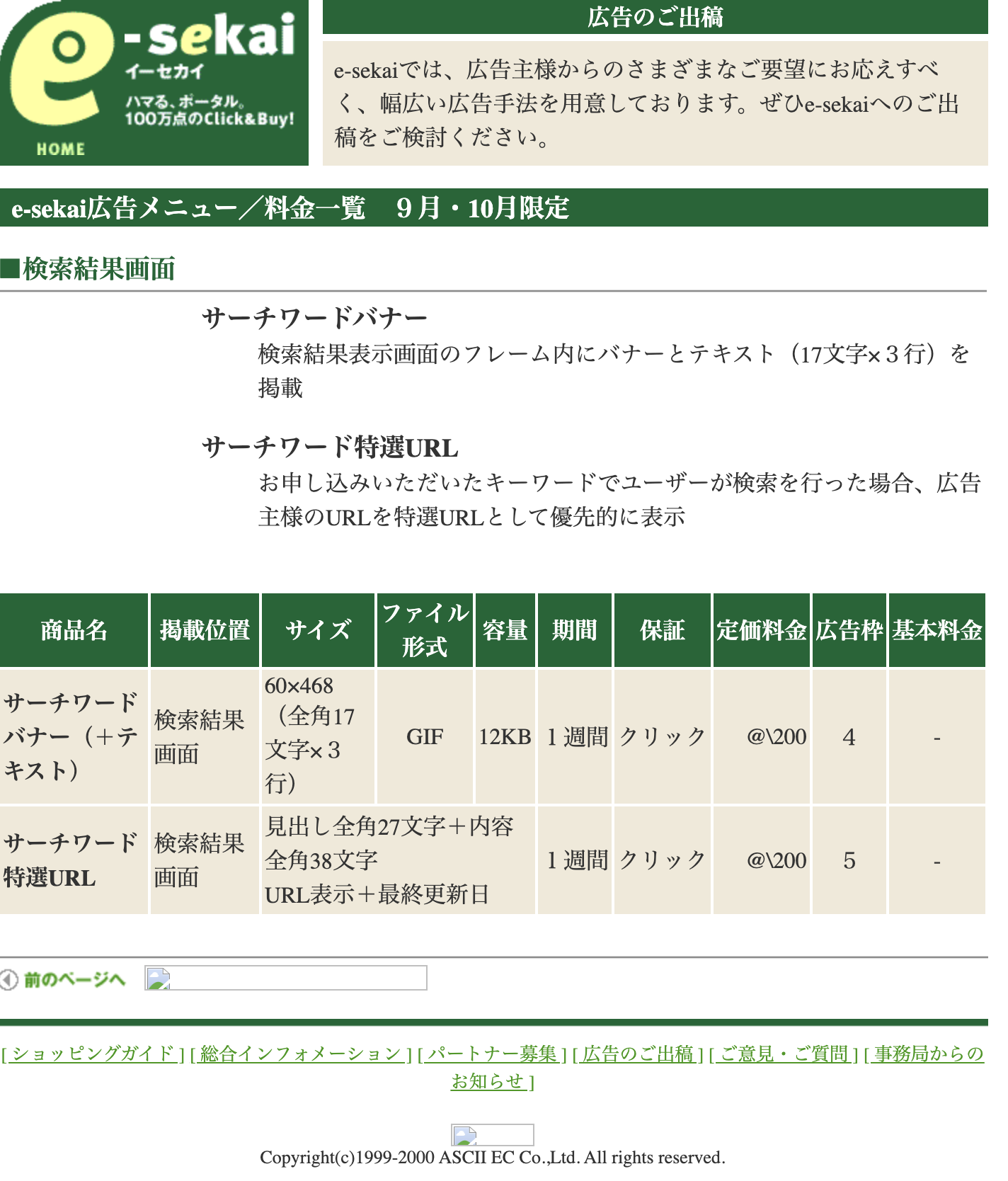 加藤: 僕が初めて検索連動型広告に出会ったのは、アスキーが運営していた「e-sekai(イーセカイ)」というサイトでした。サービス自体は、しばらくして終了してしまったんですが、e-sekaiでは検索結果の上位表示をお金で買うことができたんです。