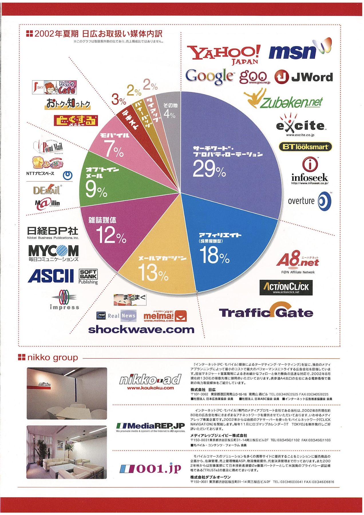 下の画像は、2002年にOvertureから声をかけられた当時の、日広創業10周年記念誌に掲載された「取扱い媒体の内訳」です。ちなみに2001年度の売上は26億円、社員数は31名でした(創業当時のエピソードは第8話を参照)。