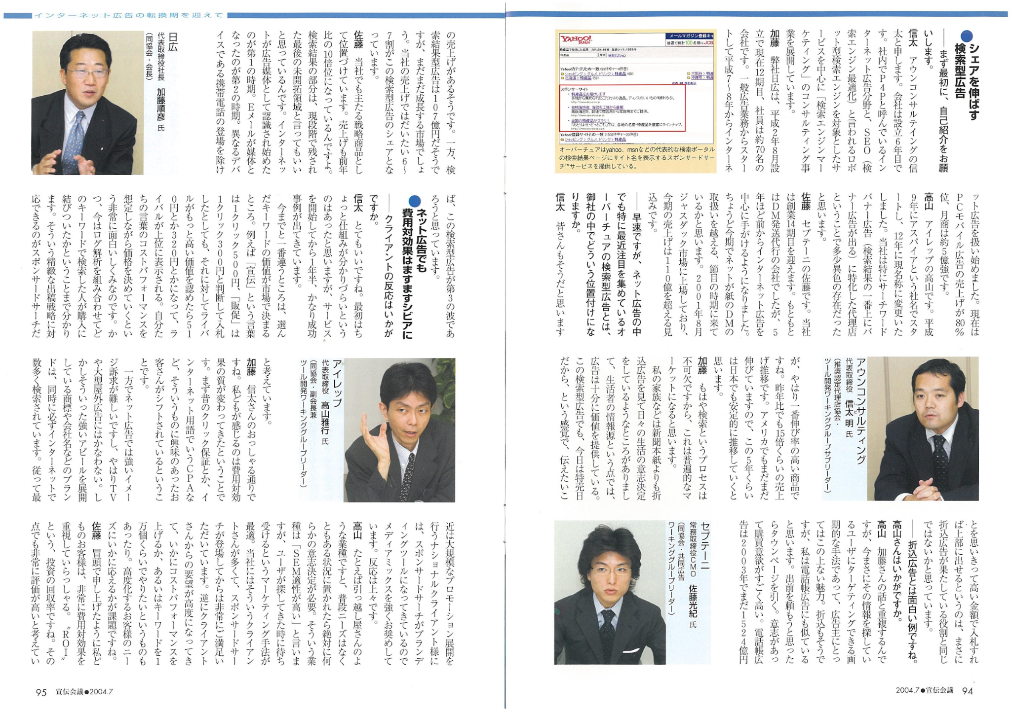 加藤:下の画像は、2004年に雑誌『宣伝会議』の広告として、Overtureが作成した推奨認定代理店協会の紹介パンフレットです。1枚目の画像の右から2番目に映っているのが僕です。Overtureはこの広告枠と制作、印刷に1000万円ぐらいかけたのではないかと思います。このパンフレットを2万部くらい抜き刷りしたと記憶しています。