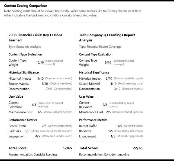たとえば、2008年の金融危機に関する記事は、歴史的重要性と安定したエンゲージメントにより高得点になるかもしれない。それに対し、四半期決算の記事は長期的な価値が最低限にとどまり、点数は低くなるかもしれない。