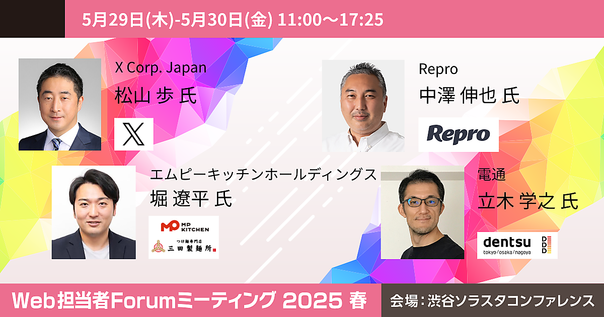 X、コクヨ、日経新聞、三井住友海上などが登壇する「Web担当者Forum ミーティング 2025 春」を5月29日(木)、5月30日(金)に開催します。今回は、リアル(東京・渋谷)とオンラインでのハイブリッド形式で実施します。