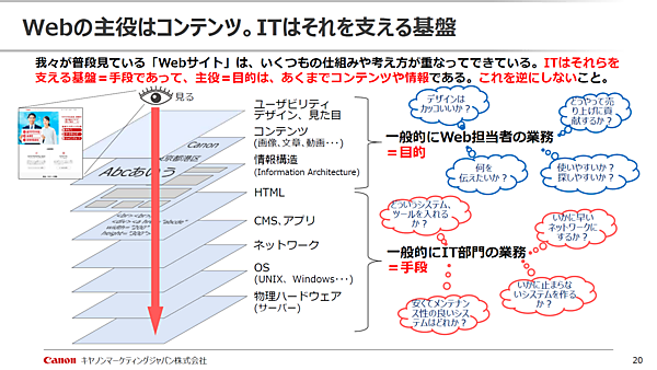 このときに注意すべきポイントとして、西田氏は「決してITの視点で考えない、ユーザー(お客様)の視点で考えること」を挙げる。あくまでWebサイトの主役はコンテンツであり、ITはそれを支える基盤・手段に過ぎない。これを逆にして、最初に手段(=IT)を考えると失敗してしまう。