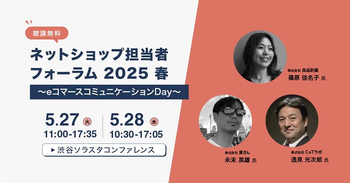 5月27日(火)+28日(水)に大型オフラインECイベント「ネットショップ担当者フォーラム 2025 春 ~eコマース コミュニケーションDay~」を東京・渋谷ソラスタコンファレンスでリアル開催。良品計画、オイシックス・ラ・大地、資さん、大丸松坂屋百貨店、ヤマダデンキ、Amazon、サザビーリーグアウルスケープなど著名企業の実践的事例や知見を学べるセミナーを多数、用意しています。