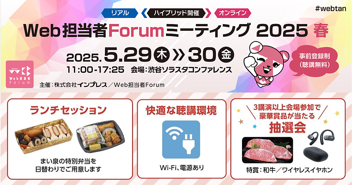 5月29日・30日に開催する「Web担当者Forumミーティング 2025 春」。今回はオンラインとリアルのハイブリッド開催ですが、編集部のおすすめは会場参加です! リアルならではの体験ができます。この記事では、イベントをさらに楽しくお得に聴講できるポイントを紹介します。