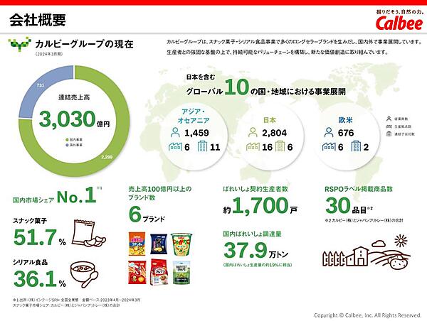 現在、同社の売上高の約3,000億円のうち7割以上が国内であり、スナック菓子市場では51.7%、シリアルでは36%のシェアを誇る。100億円以上を売り上げるブランドは「ポテトチップス」「堅あげポテト」「じゃがりこ」など6つにのぼり、それらの商品を約1,700戸もの生産者が支えている。