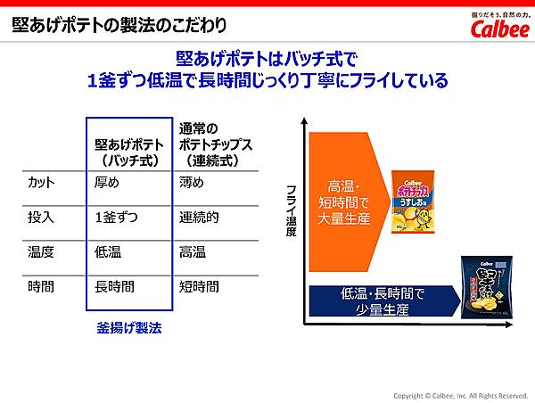 その結果、徐々に人気が上がり、販売地域を広げて2005年に全国展開を完了させた。12年という時間を必要としたのは、通常のポテトチップスとは全く異なるバッチ式の釜揚げ製法だったことで、製造ラインを新たに増設する必要があったためだという。